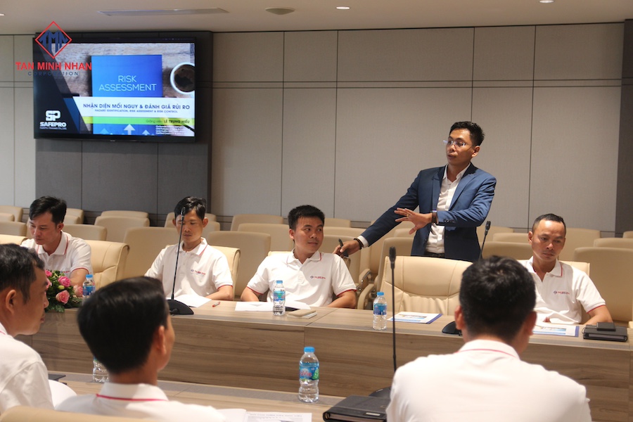 Chương trình đào tạo và bồi dưỡng công tác HSE đợt 1 tại Trụ sở Công ty Tân Minh Nhân do anh Lê Trung Hiếu – Giảng viên đào tạo HSE đến từ Công ty Safepro Việt Nam trực tiếp hướng dẫn. Là người có kinh nghiệm dày dặn trong việc đào tạo bồi dưỡng công tác HSE. Giảng viên đã chia sẻ nhiều kiến thức về kỹ thuật và kỹ năng thực tế trong công tác an toàn lao động như: phương pháp tiếp cận và triển khai quy định về an toàn lao động; đánh giá rủi ro; kỹ năng phân tích nguyên nhân và những kỹ thuật chuyên môn như an toàn trên cao; an toàn điện; an toàn thiết bị cầm tay…